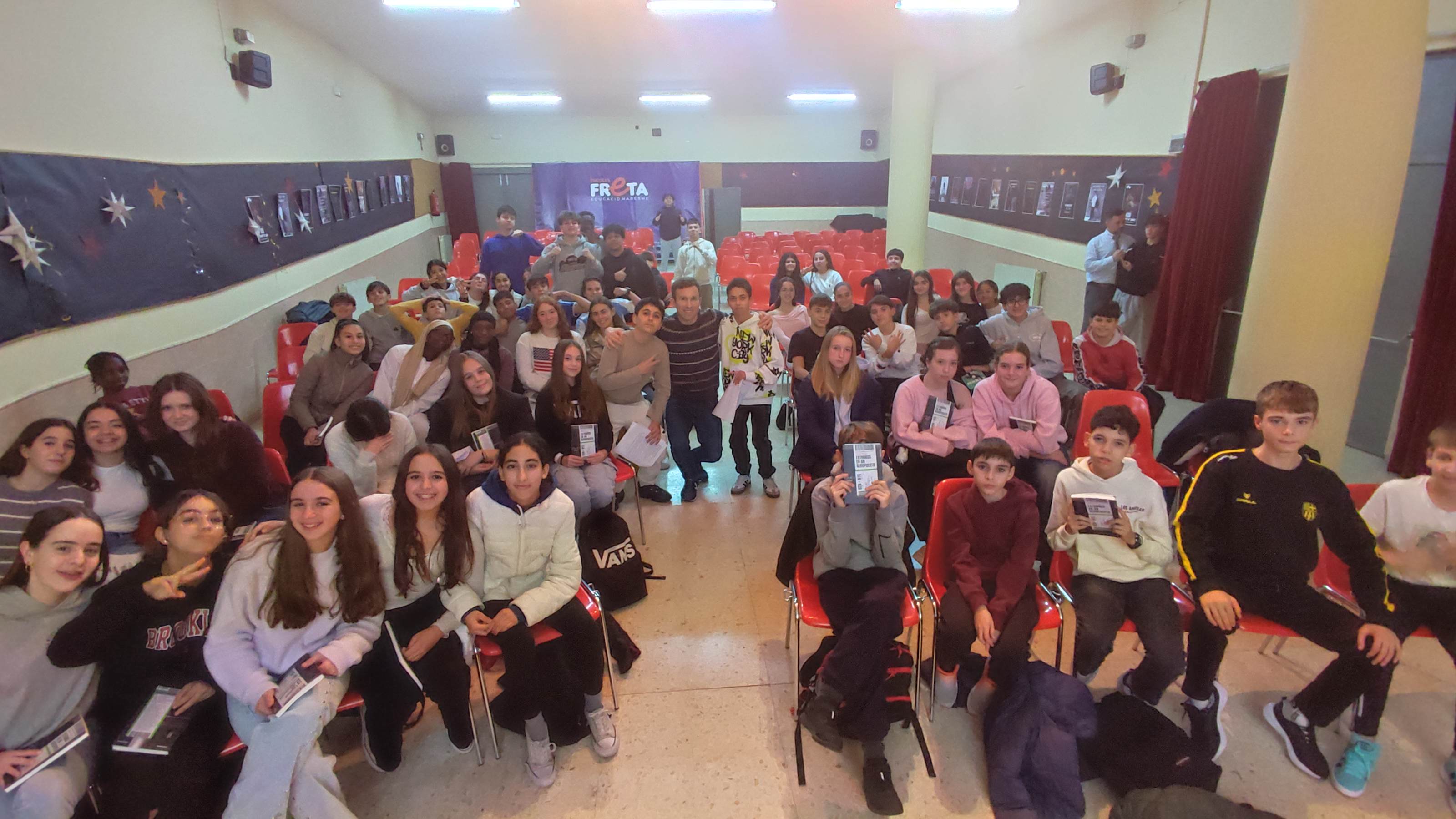 I sis! Aquesta tarda he visitat la gent de 2n de l’escola Freta de Mataró per xerrar sobre Extraños en un aeropuerto, tot i que l’alumnat també s’havia llegit Nadar o morir el curs passat. La visita ha estat molt ben organitzada. M’havien preparat un petit plató a l’escenari de la sala d’actes i hem començat el col·loqui amb un vídeo molt amè sobre la meva trajectòria professional i les opinions d’alguns lectors sobre la novel·la. Tot seguit, dos alumnes, el Juan i el Yusef, m’han presentat i han donat el torn de paraula als seus companys, que m’han anat fent un bon grapat de preguntes sobre l’ofici d’escriure i la novel·la. Gràcies per la vostra preparació! A la signatura de llibres, m’ha fet moltíssima il·lusió que alguns de vosaltres em confesséssiu que no us agrada llegir, però que els meus llibres han estat l’excepció. Aquests comentaris em fan estimar la meva professió. Us agraeixo, Marta i Alessio, el bon treball que heu fet amb la novel·la. I gràcies, Josep, per acompanyar-me en representació de l’editorial. A reveure!