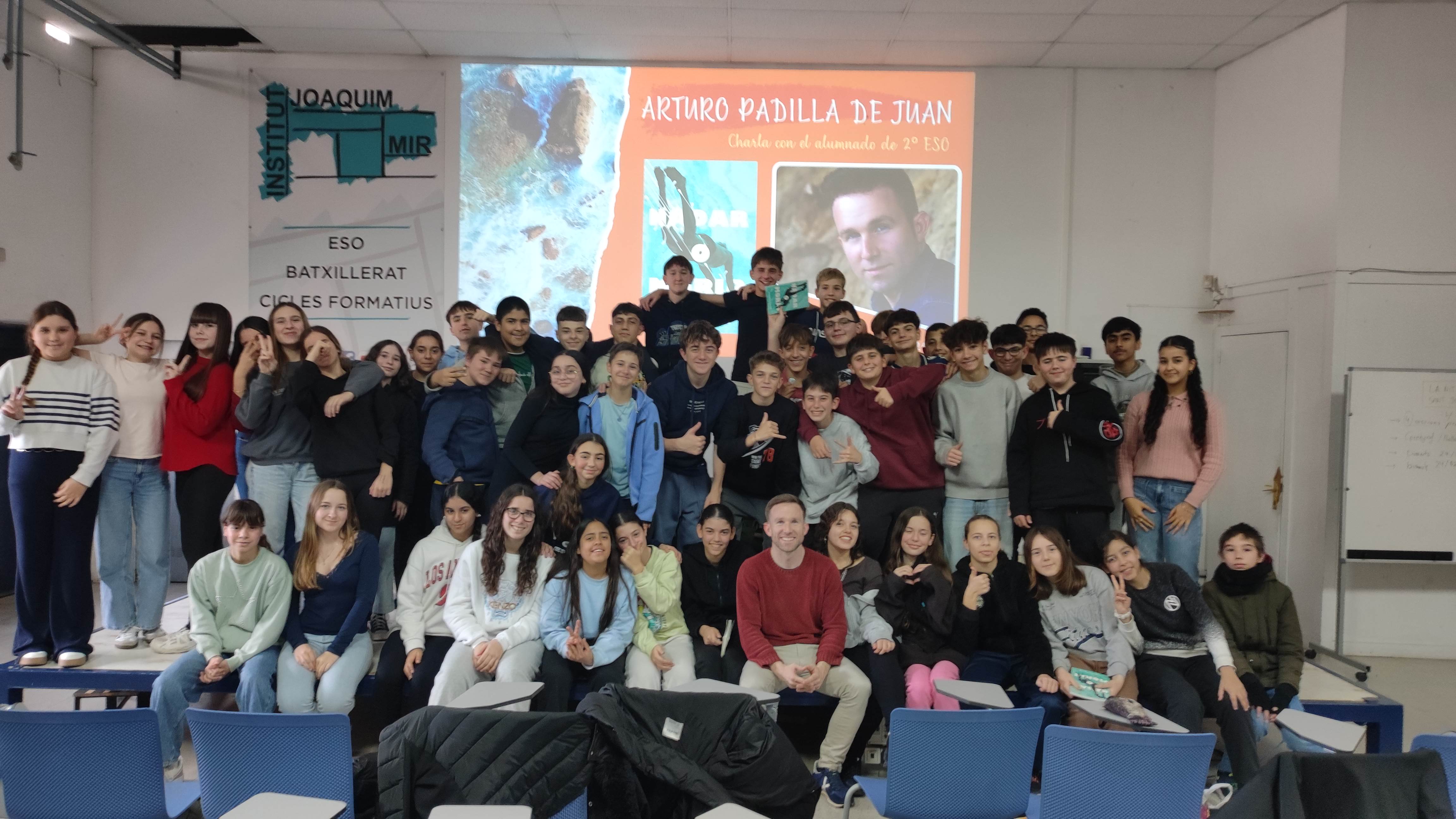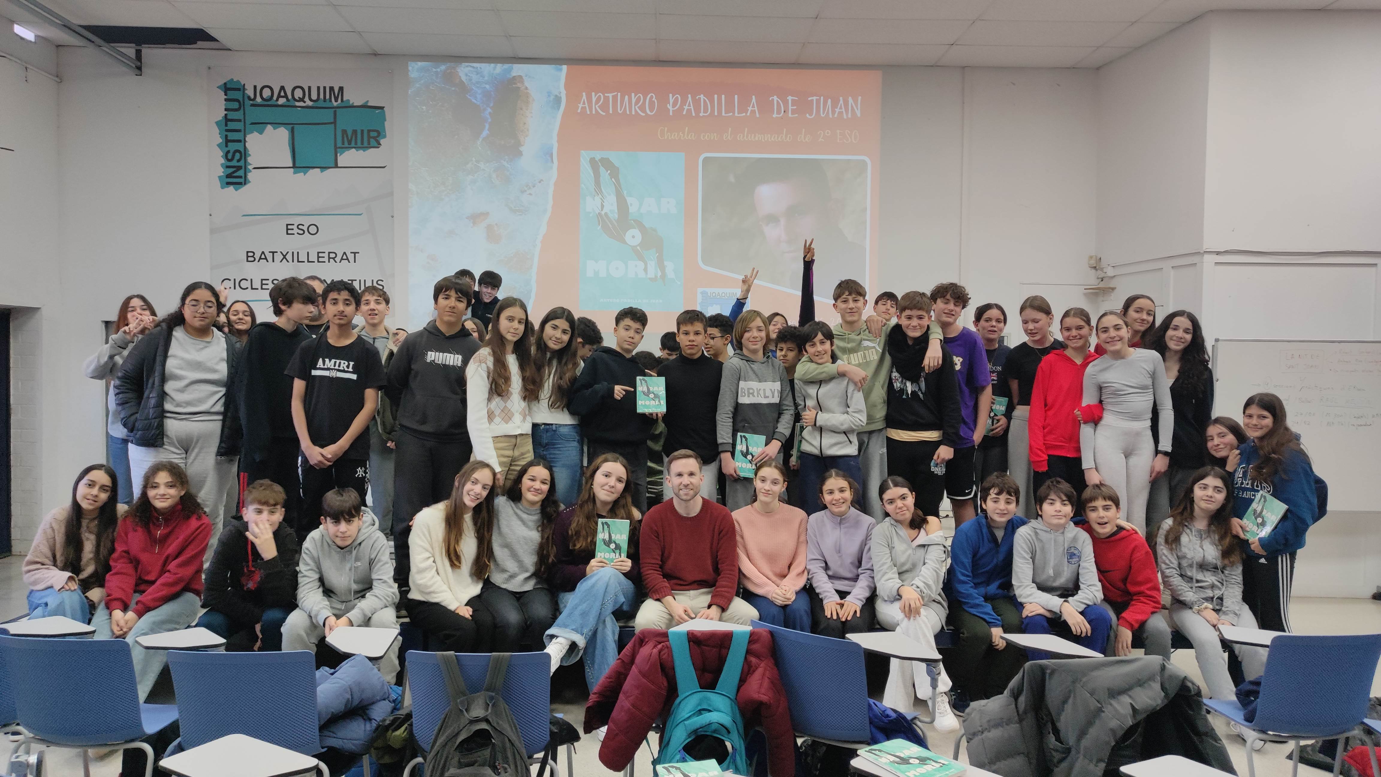 I trenta-una! Aquest matí he visitat la canalla de 2n de l’institut Joaquim Mir de Vilanova i la Geltrú per xerrar sobre Nadar o morir. La trobada ha semblat una entrevista a un programa de televisió, moderada per l’Óscar, el professor de castellà. M’ha encantat veure els vostres treballs sobre la novel·la, com ara finals alternatius, còmics amb escenes de la novel·la i knowllings. A més, he anat contestant una selecció de preguntes que l’Óscar havia seleccionat. El temps ha passat volant. Gràcies pel vostre entusiasme i afecte. M’ha fet molta gràcia que molts us anéssiu acomiadant de mi abans de marxar de la sala d’actes. Gràcies, Óscar, per la feinada d’organitzar-ho tot. Una abraçada!
